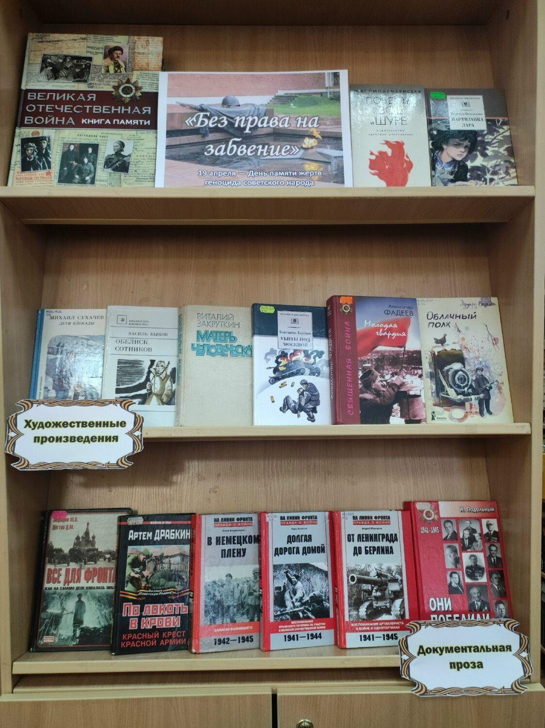 Центральная городская библиотека имени М. В. Ломоносова предлагает вниманию читателей книжную выставку, приуроченную ко Дню памяти жертв геноцида советского народа, совершенного нацистами и их пособниками в период Великой Отечественной войны (19 апреля). На выставке представлены документальные издания и художественные произведения, посвященные событиям Великой Отечественной войны.