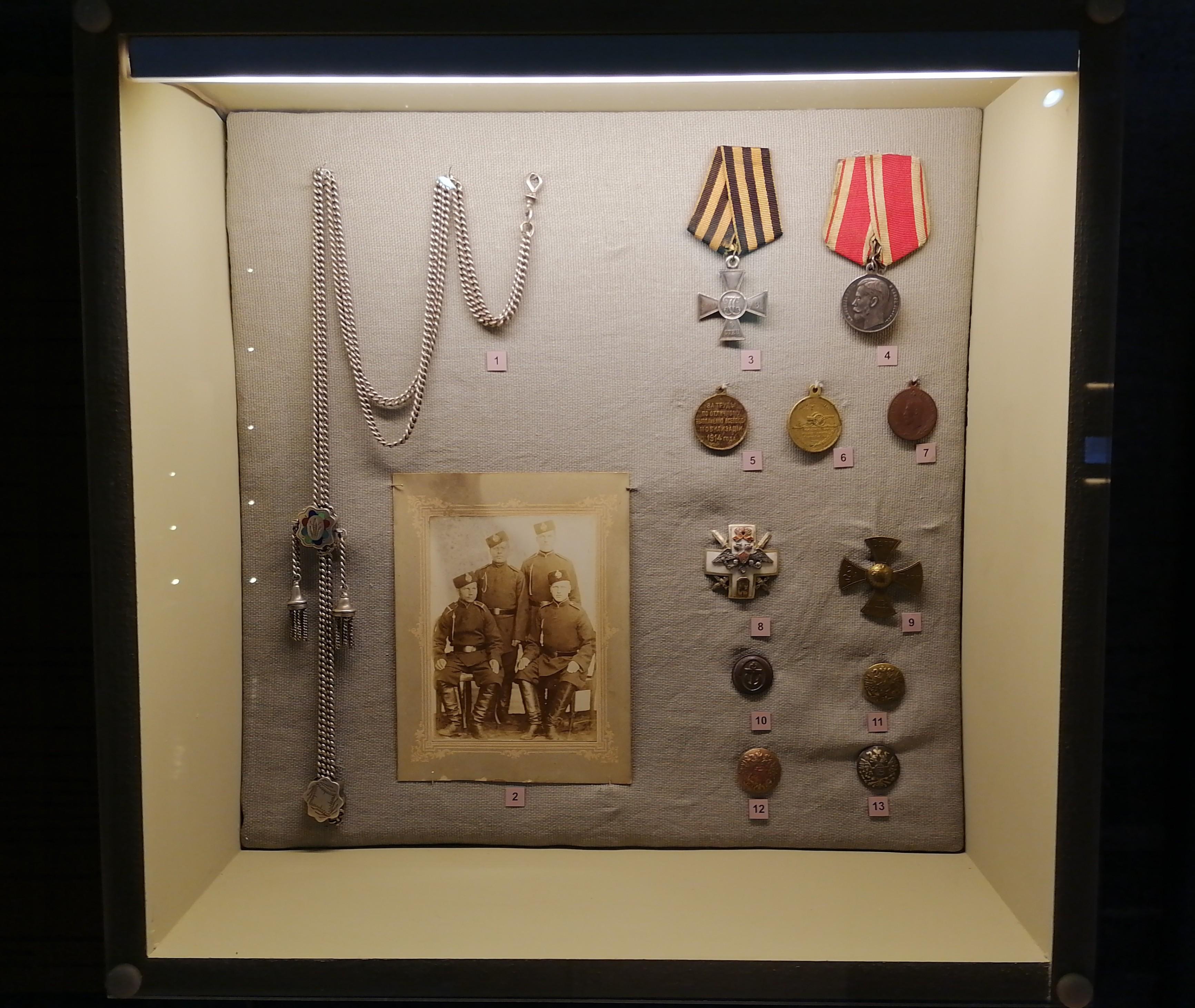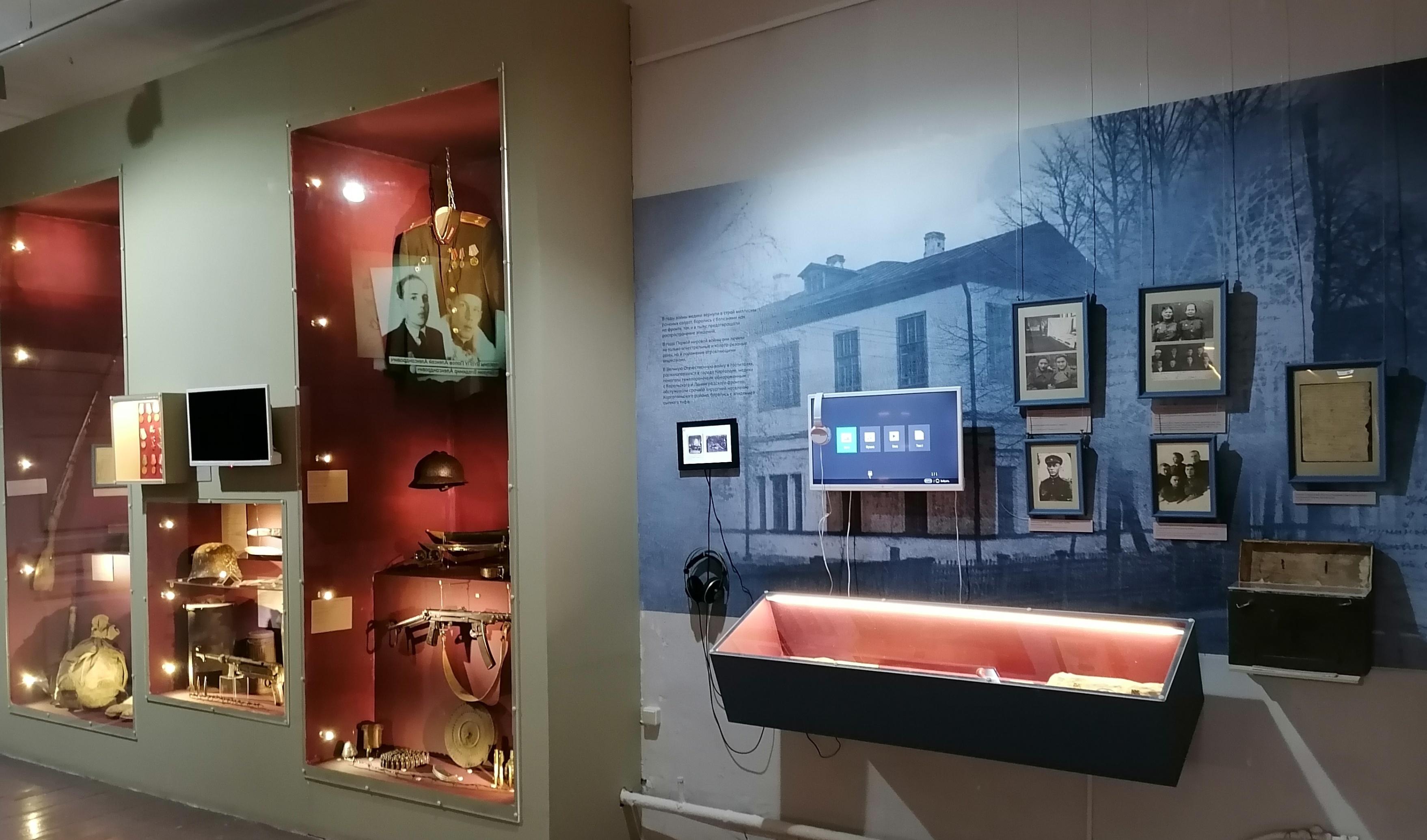На выставке показана и роль города Каргополя в годы двух мировых войн, которая выразилась в денежных и вещевых пожертвованиях, исходящих от мирного населения, в помощи семьям лиц, призванных в войска. В годы Великой Отечественной войны в Каргополе был построен аэродром, располагался 909-й истребительный авиационный полк, работали три госпиталя, население города пополнили курсанты Великоустюгского военного пехотного училища и др.